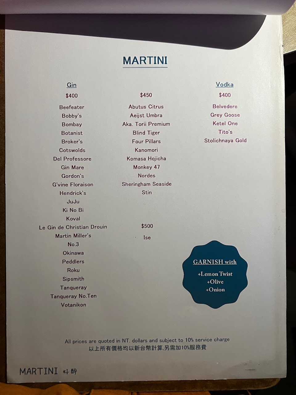 這是我結束台灣三天之旅後最後去的雞尾酒吧。酒的價格有點貴,但考慮到裡面有漂亮的魚缸、友善的工作人員以及靠近中山站的位置,這是可以理解的。 (感謝工作人員也找到了我不小心掉下來的錢包。)啤酒價格為每杯200台幣,雞尾酒大部分為350或400台幣,每人最低訂購量為平日300台幣,週末500台幣。