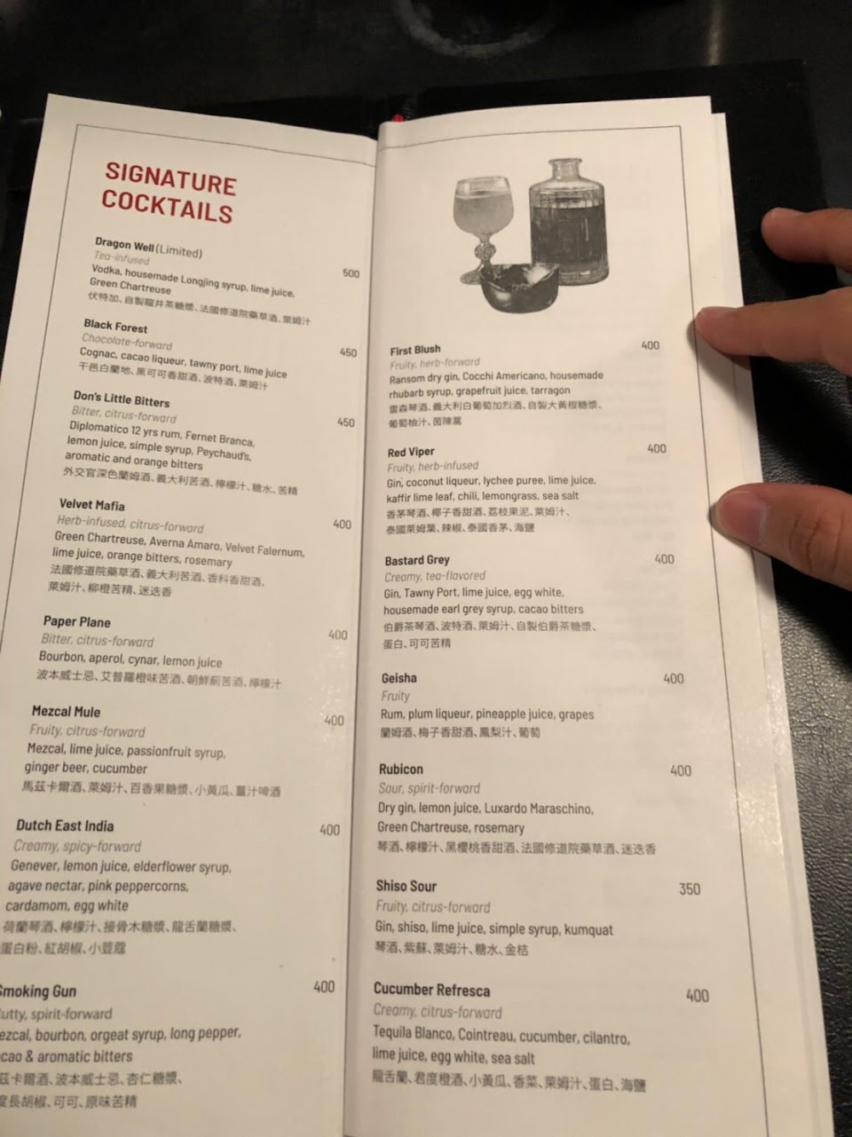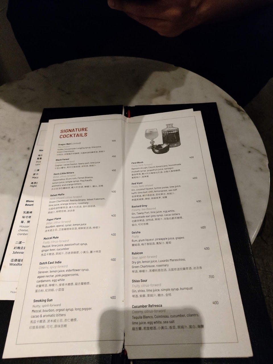 晚上九點過後就只有提供今日限定的四種調酒??,我們今天嘗試了三種(神息、灰色派對、光馬丁尼),點了一份雞米花(360元),不過覺得實話有點小份,但是酒吧的環境說實話還不錯,並不會讓衣服有一些Bar的菸酒味,整體來說是一間還算有質感的Bar。調酒本身也滿不錯的。