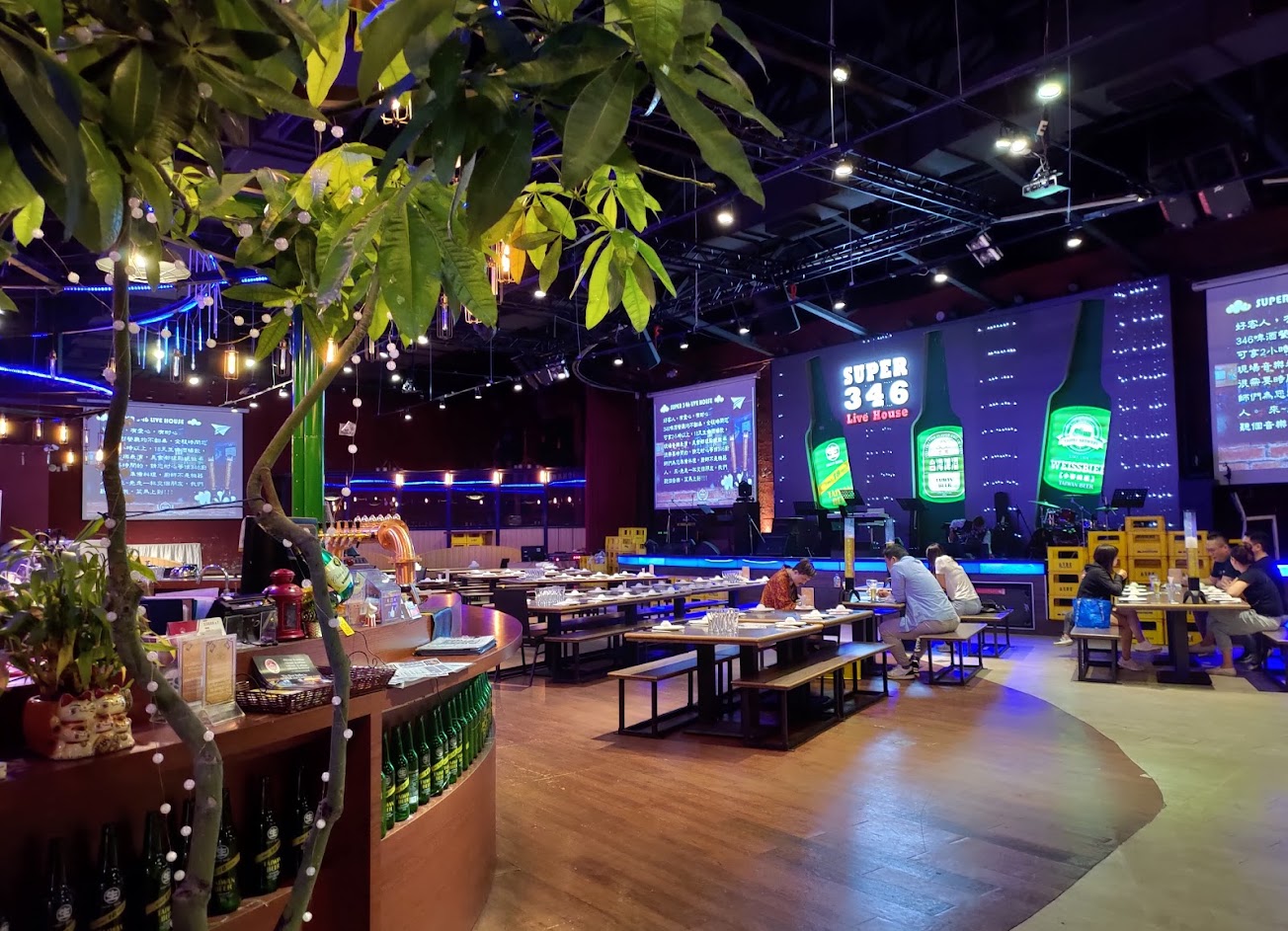 採倉庫風裝潢的空間,設有露天陽傘座位區、現場音樂表演舞台,以及供應酒吧餐點的吧台。