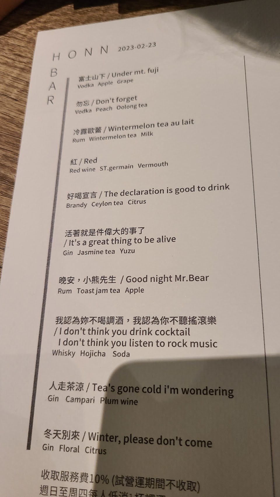 原創酒單每天都會有變化、還有老闆的心情小記,很有創意~