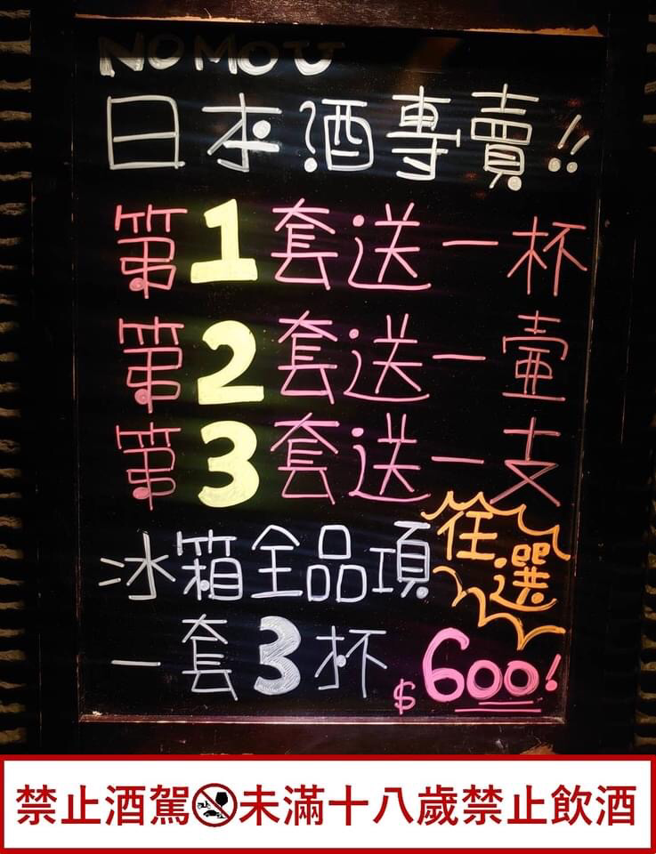 隱身於農安街巷內的日本酒吧,下午五點開始營業,空間不大,清酒一套試飲為台幣$600 ,專業的店員會為你介紹喜歡的口味,店內沒有提供下酒菜,不過客人可以自行攜帶.非常適合想要小酌,又不想要去酒吧那種吵雜複雜環境的人。清酒、燒酌以及生啤酒都有賣喔!