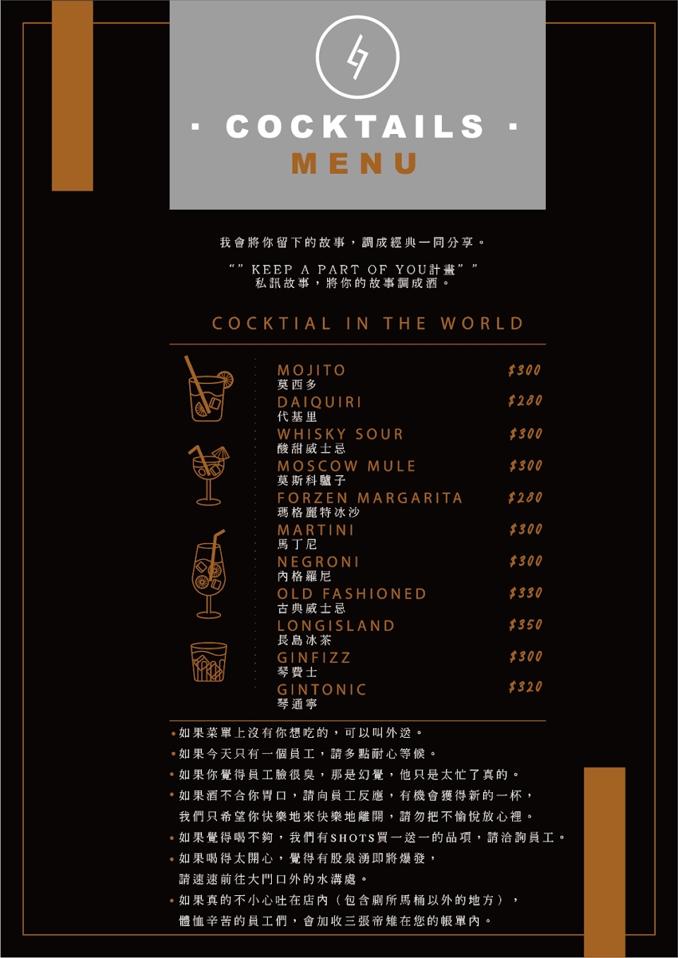 調酒部分水準就中等,也沒有太多藏酒可以選擇,收費在台北不算高,一杯280-350其實ok,可惜的是一開始來不知道是沒備料好還是怎麼樣,上酒速度很慢,現場其實也才四組客人,然後水也沒有提供,要主動去問,水杯竟然是給冰杯,也是蠻奇怪的,畢竟水也是常溫而已不是冰的啊。
