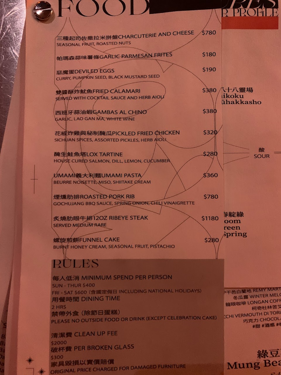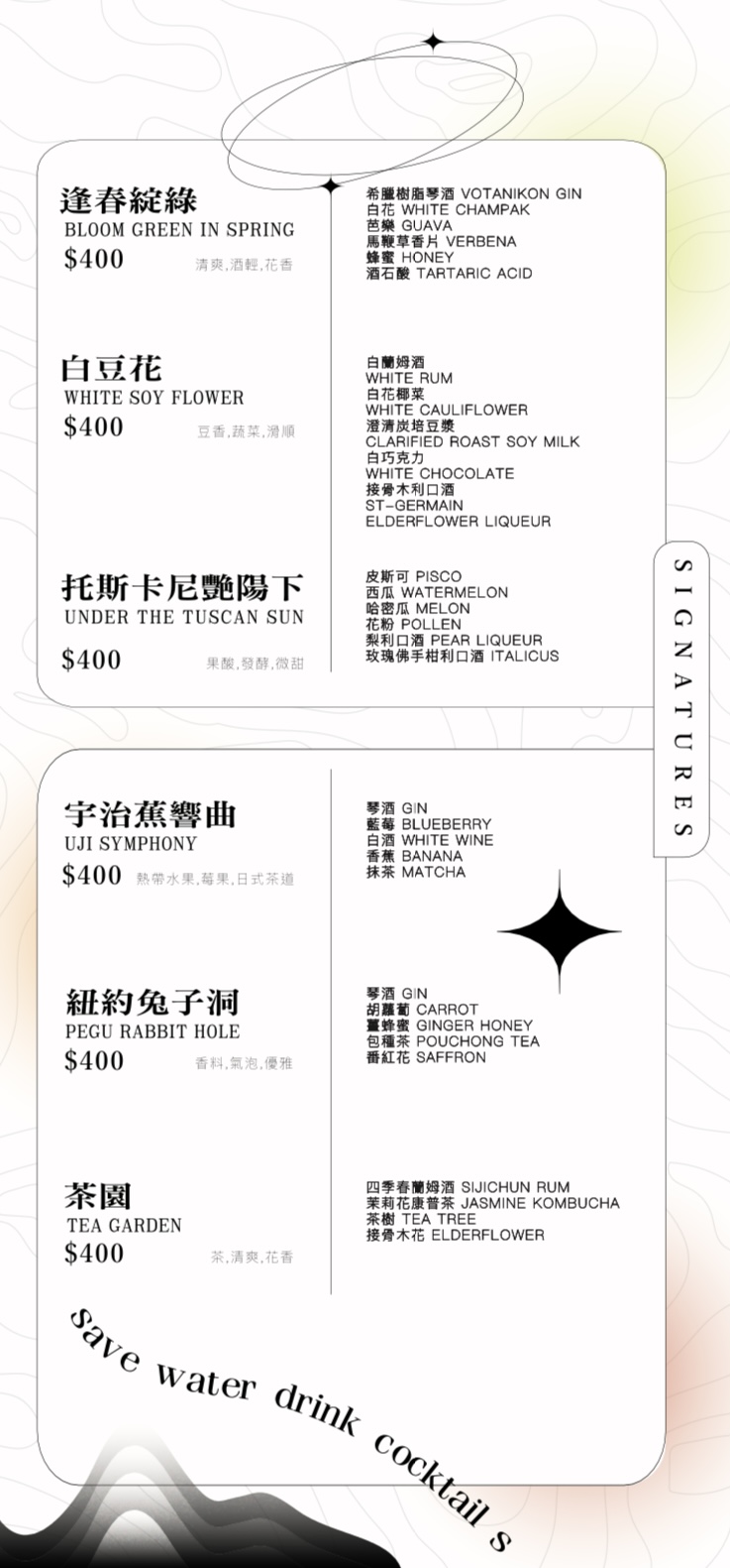 老闆很專業的介紹了每杯signature cocktail, 只能說bartender真的很有巧思及創意,每一杯都用了很特別的元素去呈現,是在台北其他酒吧沒有喝過的! 因為太好奇每一杯的味道,所以我當天全部點了一輪,每杯都在水準之上,非常滿意!