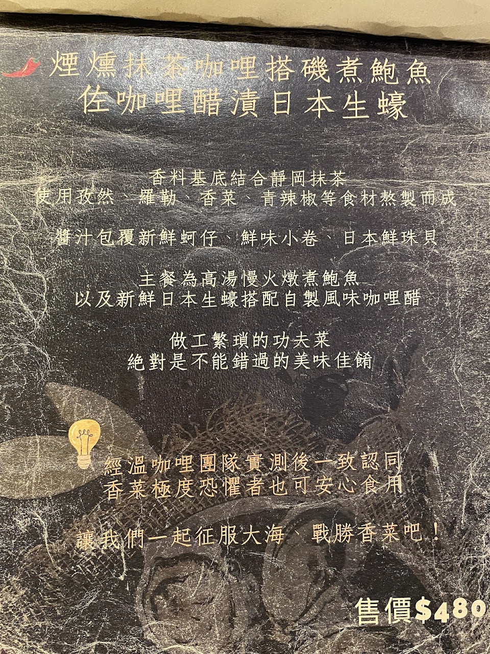在IG廣告上看到這家店,立刻被有澎湃擺盤的咖喱給吸引,與友人一同在平日晚上到訪;我們有事先打電話訂位,服務人員的親切和禮貌讓我非常印象深刻,也有主動提出如果有特別想吃的料理可以事先預訂,以免向隅。