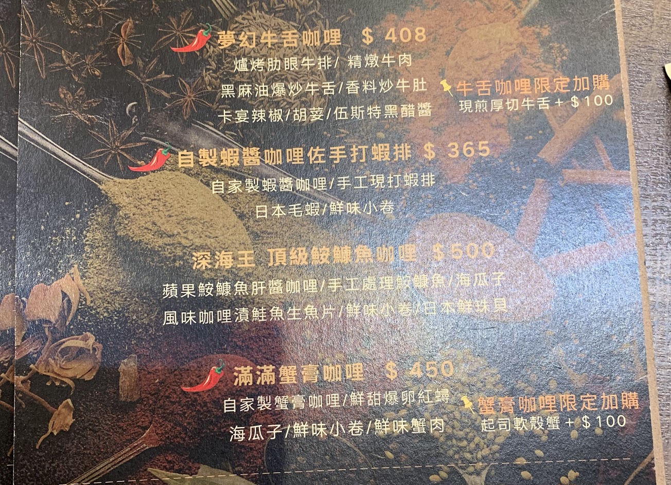 相當有特色的咖哩店,把咖哩成功做出一個新高度!主打海鮮類以及牛肉類,每款主餐的咖哩都有特別調製過,非常融合不會衝突。這次點蝦排裡面更是有完整的兩隻蝦,不管視覺還是味覺上都相當讓人驚艷!雖然價格比較高,但是會想要再回訪吃吃看別的口味的咖哩!