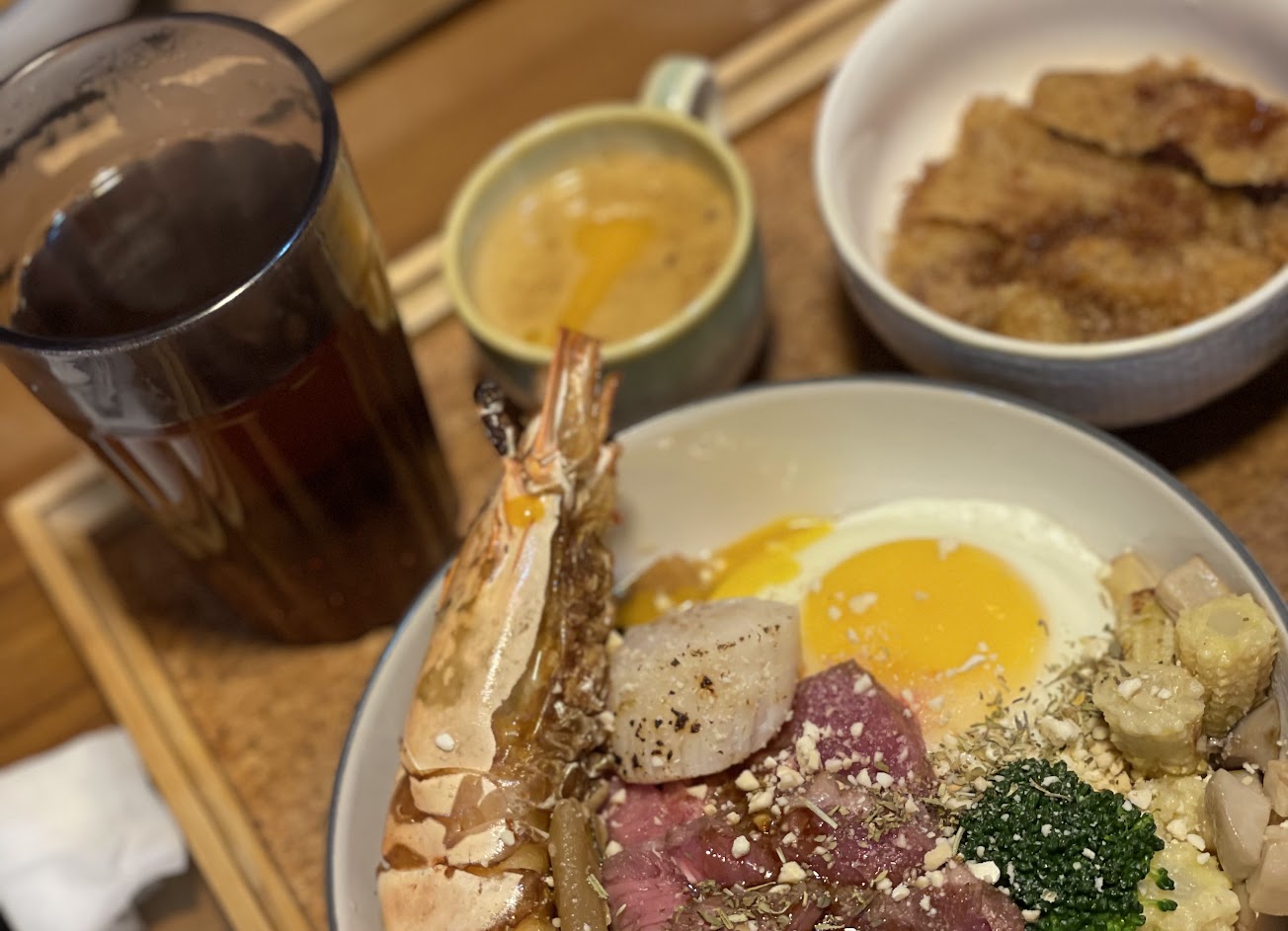 兩人同行送的炸牛排,一口咬下都是筋,如果贈送的是無法入口的食材等於沒送。咖喱的部分創意很好,融入了很多海鮮的元素,但不論是魚下巴,蝦或海膽都出現了腥味,炸蝦過乾且蝦的本體不新鮮,海膽咖喱沒有咖喱味且口感很像勾芡過的燴醬,有點讓人不知道在吃什麼。甜點算是表現最佳的部分,自製的抹茶豆花,吃得出真材實料又帶一絲抹茶香。