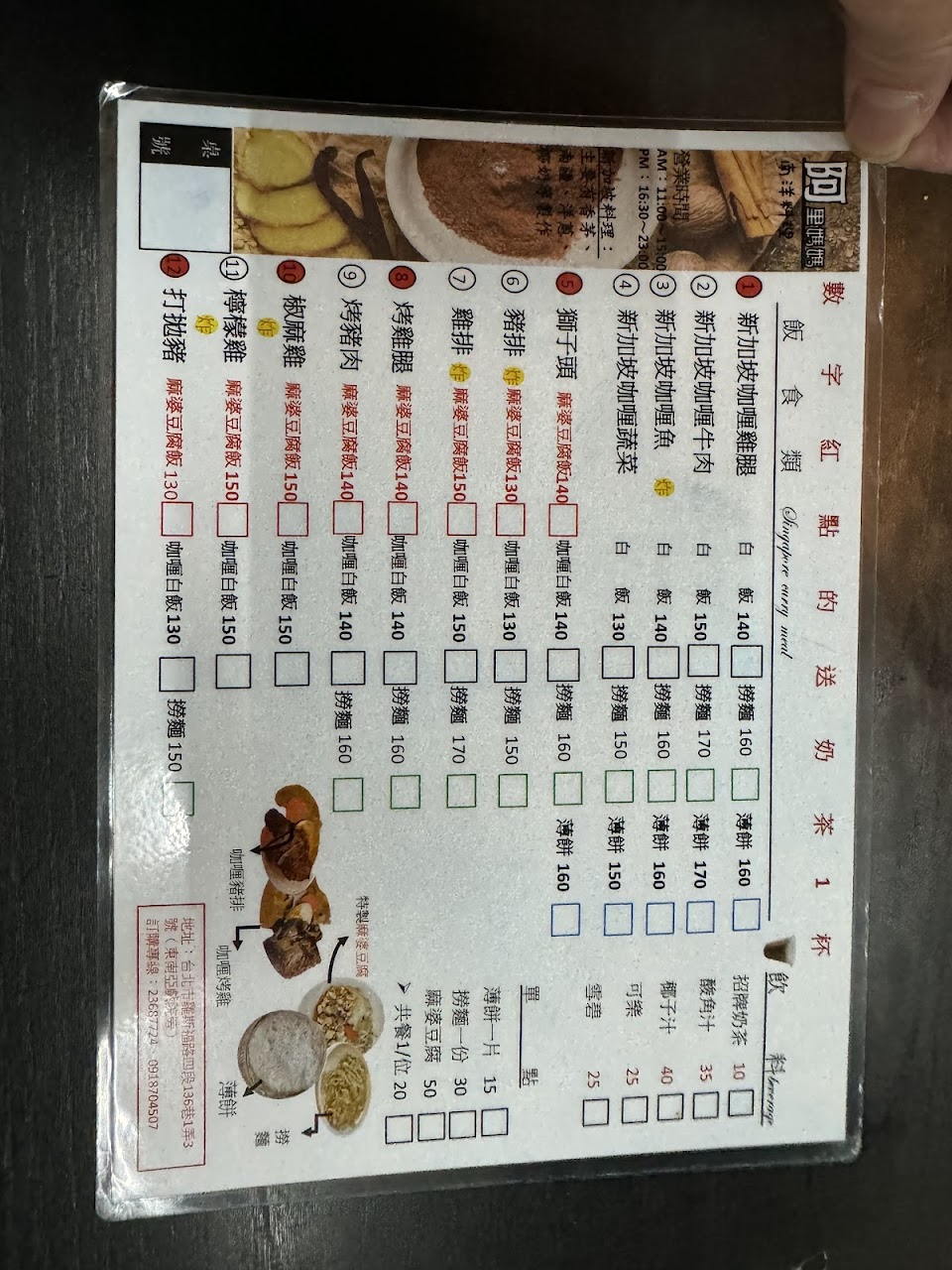 店外招牌的價位看來很平實,店內客人也多是學生,外帶新加坡咖哩蔬菜配薄餅以及椒麻雞飯,等候之際順手捐了發票給浪浪,也才看到牆上有搭配餐點奶茶特價10元的優惠,詢問之下,原來今天是周一每份餐點都有附贈一杯奶茶,真是太幸運了! 椒麻雞飯還有附咖哩,頗為意外,但主菜口味與想像和經驗有些落差,不過調味是好吃的。咖哩蔬菜的種類及份量都令人非常欣喜,香醇湯汁也是可以直接喝的烹調方式,薄餅軟Q不太會吸附稀薄湯汁,但還是能蘸一些,兩款咖哩的味道也不同,製作用心,並且涼掉也都還很好吃,非常推薦! 服務 外帶 餐點類型 晚餐