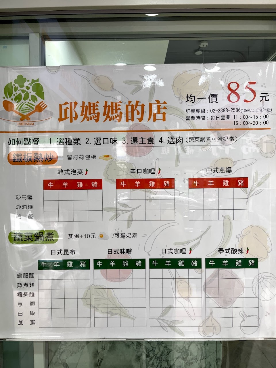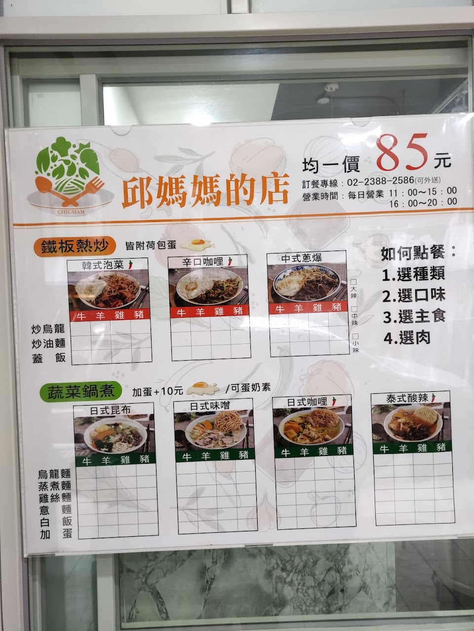 北車補習街這帶有好幾間都叫邱媽媽? 這間是有賣鐵板熱炒跟蔬菜鍋煮的邱媽媽,座位有靠牆一排適合單人坐,也有四人一桌的座位(人多需併桌)。 菜單簡單明瞭,選種類>口味>主食>肉。