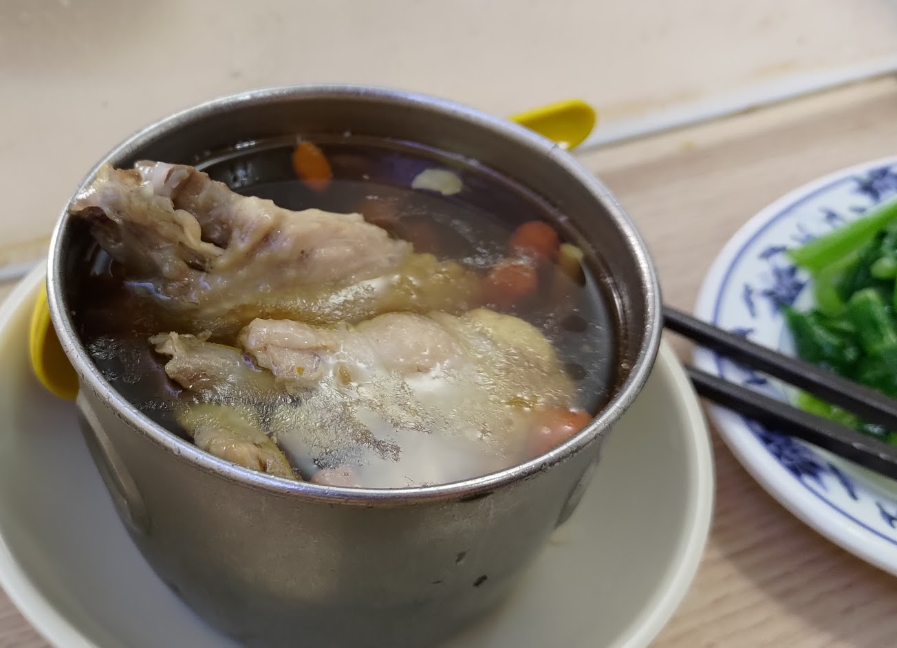 點了鳳梨苦瓜雞.蛤蜊雞,苦瓜排骨湯,我喝的是鳳梨苦瓜雞湯,苦瓜吃起來不會很苦湯頭喝了會回甘,雞腿肉燉的很透,但不會爛到一拿起來就骨肉分離,給小孩子吃,啃到剩一支骨頭了還捨不得丟,我覺得雞湯真的好喝。