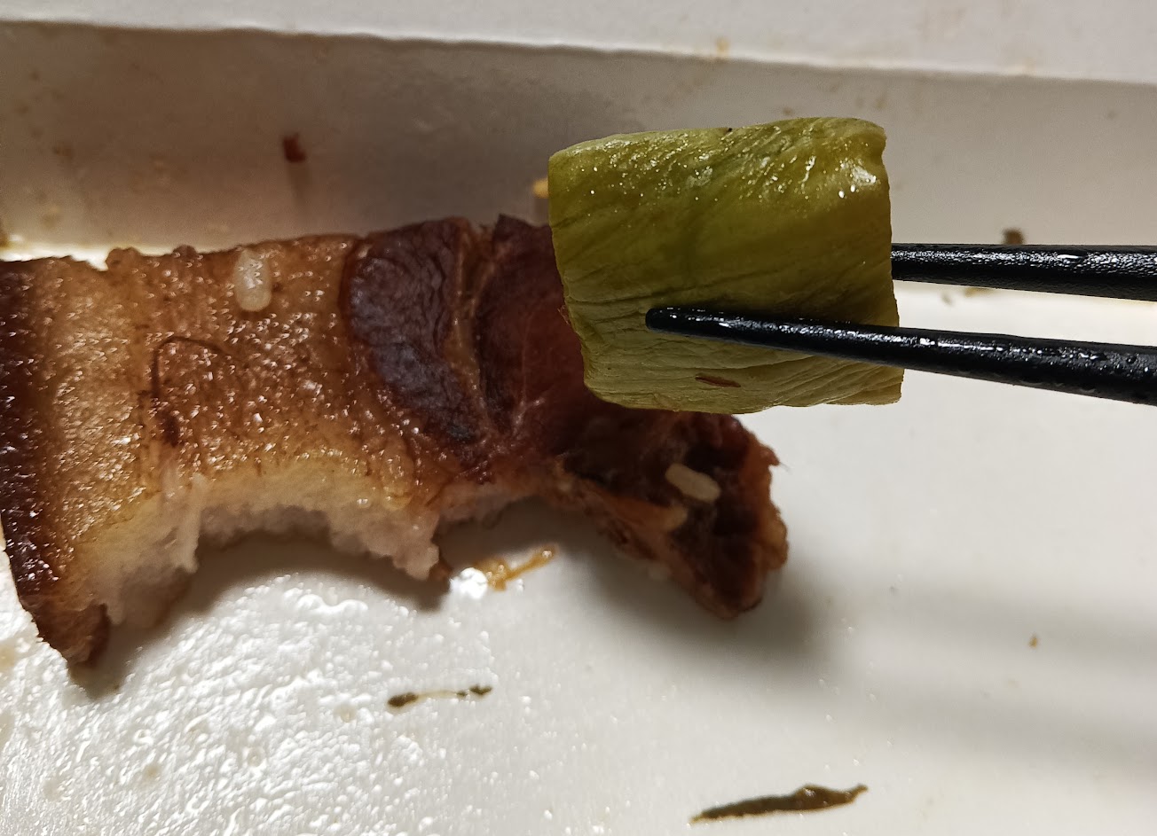 屬於肥瘦相間的流派,不會過膩,也不會過乾,搭配附上的醃瓜清爽解膩。