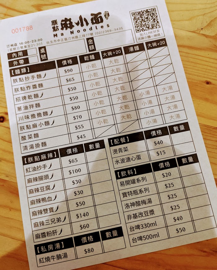 位近台電大樓站的汀州路上、恰好在三軍總醫院尾端的對面這邊的這間麵攤,雖然店面是稍嫌黯色有些難注意到、不過也算是和電商餐券平台的合作下讓人稍微知道有這間在這裡;縱使是勉為需要和他人併桌、不過店內位子仍是算有些擁擠的;而雖店頭擺上的選料攤車讓人以為會是滷味的形式,不過實際菜單都是比較偏向麻辣燙形式居多。 店家招牌的朕點麻小麵一份是要上了70元,而內容物大致上就是白細麵加上川味醬湯稍帶辣和一些時蔬和芝麻小撮佐料,若要蛋的話需要另外加15元的水波溏心蛋;而另外點上店家招牌的麻辣三兄弟、有著鴨血豆腐和大腸頭而和麻小麵差不多的份量下則是來到了兩倍的140元價格,也算是有感覺到高物價的一家了。 服務 內用 餐點類型 晚餐 平均每人消費金額 $200-400