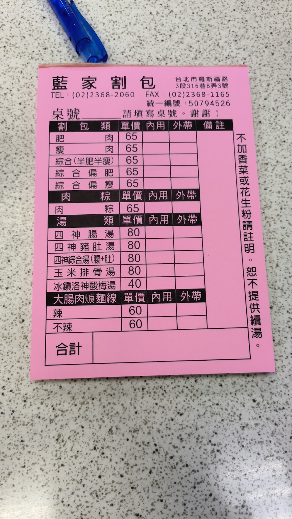 熱乎乎的台灣小吃美食藍家割包總是在排隊?,今天特別避開了用餐尖鋒時間來一嚐台灣三明治? 割包內餡可根據喜好選擇肉的肥瘦,這真是極貼心的服務,老人家大多喜好帶肥帶油的肉質,但,偏瘦也不會太乾柴?香菜和花生粉,是割包的soul mate ,強力建議一定要加入,那融合在一起的美味缺一不可?熱熱的割包很膨皮,吃一個就是暖心❤️ 第一次點了玉米排骨湯,很驚豔?湯,好甜!玉米的天然甜,排骨燉得軟嫩適中,玉米粒粒分明,喝一碗超滿足?排隊,真不是浪得虛名? 服務 內用 餐點類型 午餐 平均每人消費金額 $1-200 餐點:5 服務:5 氣氛:5 建議的餐點 綜合割包 掛包 鮮蚵麵線 玉米排骨湯