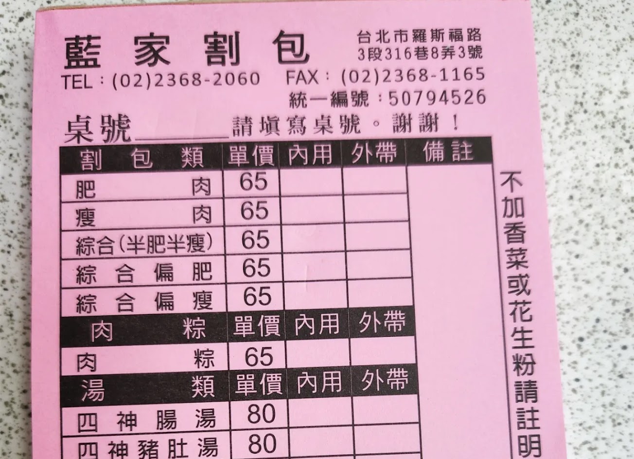 第一次吃割包 選了綜合偏瘦 65元 內用排隊不會到等太久 店家動作很迅速 翻桌速度滿快的 但座位比較靠近 滿座的時候 要移動較不方便 要拿衛生紙建議給完菜單可以先取 座位上沒有衛生紙