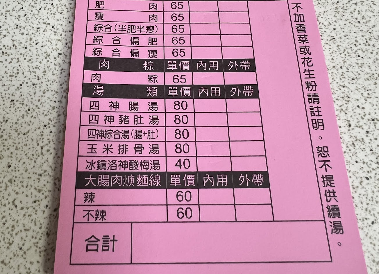 點全瘦肉覺得肉超柴,下次會點半肥半瘦試試看 非用餐時間去還是大排長龍,但店家速度蠻快,所以不用排很久