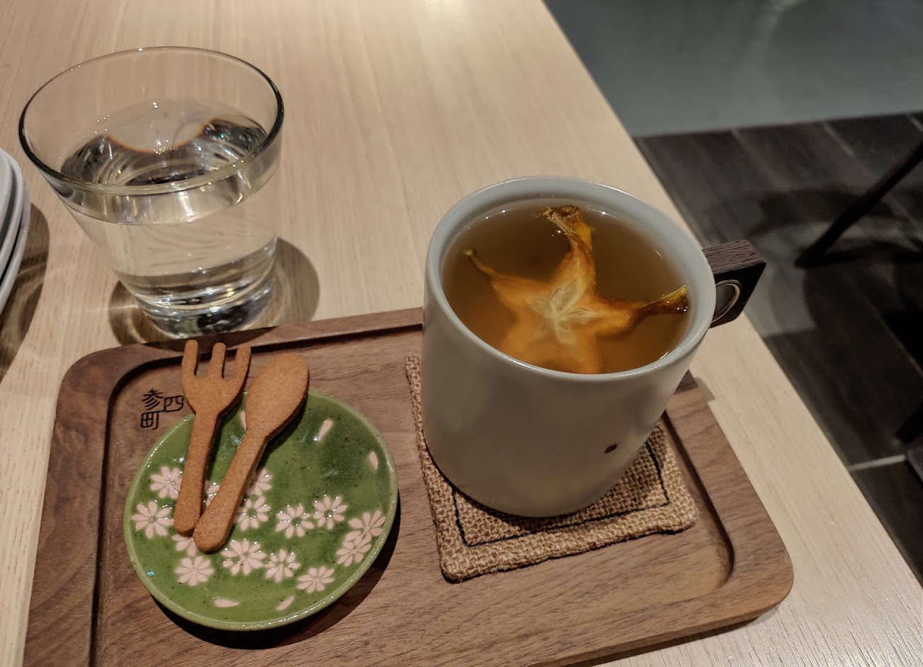 東西看起來精緻 但真的不好吃啊……炸雞很柴 海麻糬火山卷的醬汁過鹹 唯一亮點是沙拉 因此給兩星