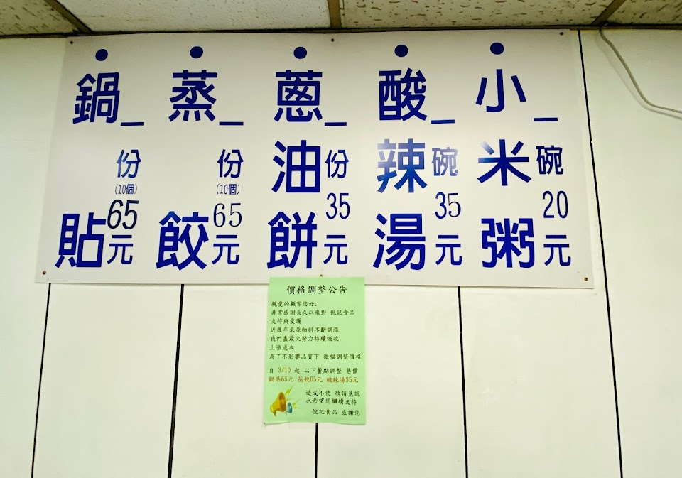 CP值高,天成飯店隔壁北車前面百元內吃一餐的稀有地點。非常懷疑店面如果是租的,真的能賺錢嗎?辛苦了,老闆和家人,要在悶熱的油煙環境工作。不喜歡油煙味跟免洗筷匙的客人就外帶吧。餐點沒有雷也沒有太驚喜。但是我今天想吃的酥皮鍋貼沒有失望。已經快吃完看到闆娘在煎蔥油餅,是厚餅耶!於是加點一份吃到爆撐。現場的調料如果把鹹醬油改成淡醬油就完美。大家:請倒一點醬油加一點黑醋加一小匙糖加辣椒醬,沾鍋貼跟蔥油餅,絕對百搭。同意網友說的蔥油餅的胡椒可以少一點或不加,但揉餅的時候蔥就要加鹽才行。還有,豆漿是農會玻璃瓶,有點意外。以上。