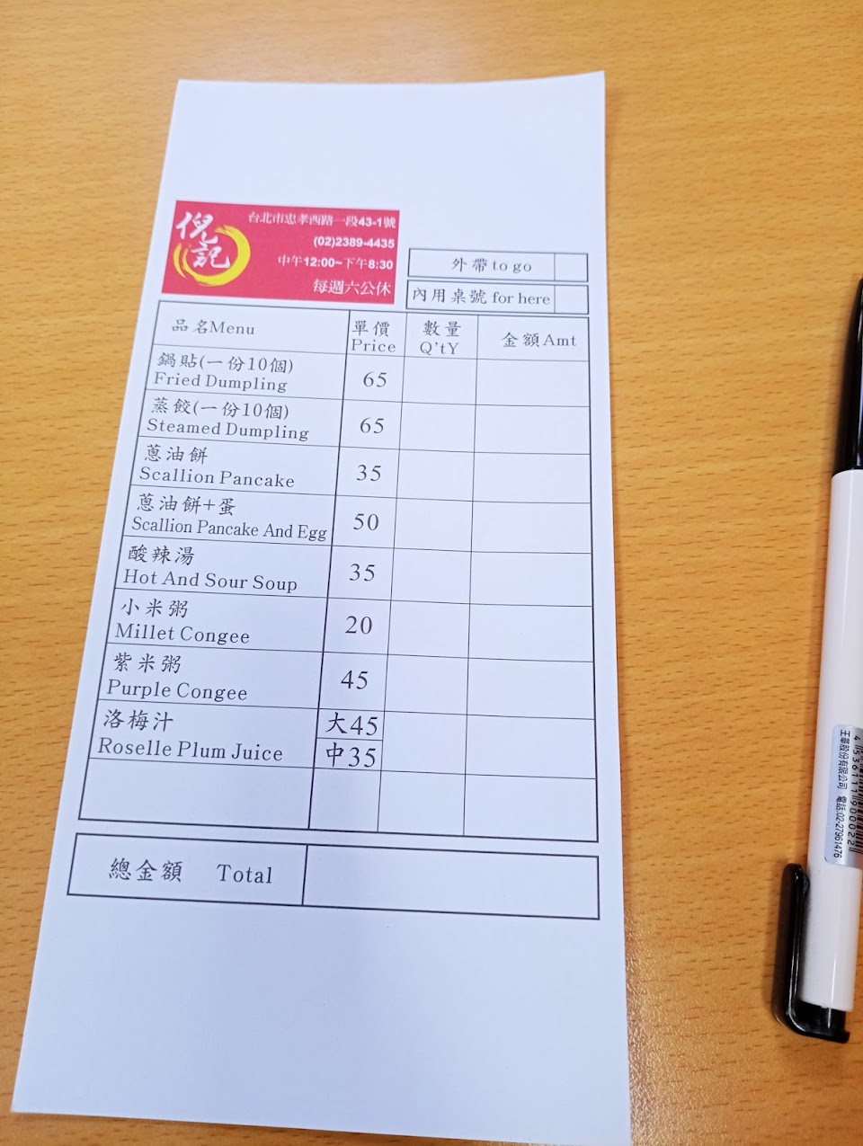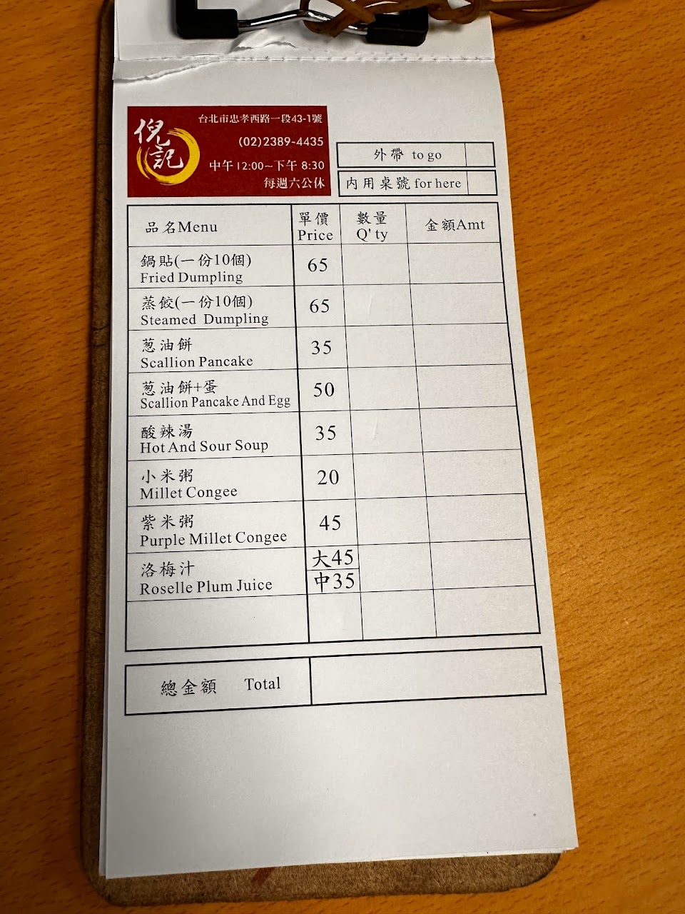 CP值高,天成飯店隔壁北車前面百元內吃一餐的稀有地點。非常懷疑店面如果是租的,真的能賺錢嗎?辛苦了,老闆和家人,要在悶熱的油煙環境工作。不喜歡油煙味跟免洗筷匙的客人就外帶吧。餐點沒有雷也沒有太驚喜。但是我今天想吃的酥皮鍋貼沒有失望。已經快吃完看到闆娘在煎蔥油餅,是厚餅耶!於是加點一份吃到爆撐。現場的調料如果把鹹醬油改成淡醬油就完美。大家:請倒一點醬油加一點黑醋加一小匙糖加辣椒醬,沾鍋貼跟蔥油餅,絕對百搭。同意網友說的蔥油餅的胡椒可以少一點或不加,但揉餅的時候蔥就要加鹽才行。還有,豆漿是農會玻璃瓶,有點意外。以上。