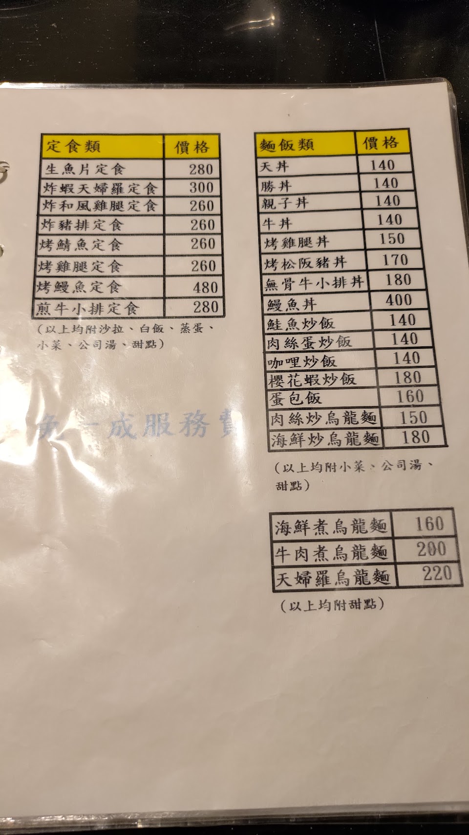 座位稍微擁擠,服務普通,但是非常的好料CP值爆表,如圖生魚片丼飯320元,有附茶,紅豆湯,味噌湯,有別於其他平價台北日料店,這裡的生食對於刀工以及新鮮度較為講究,以台北市這種價位能夠吃到這種級別的料理,實屬難得