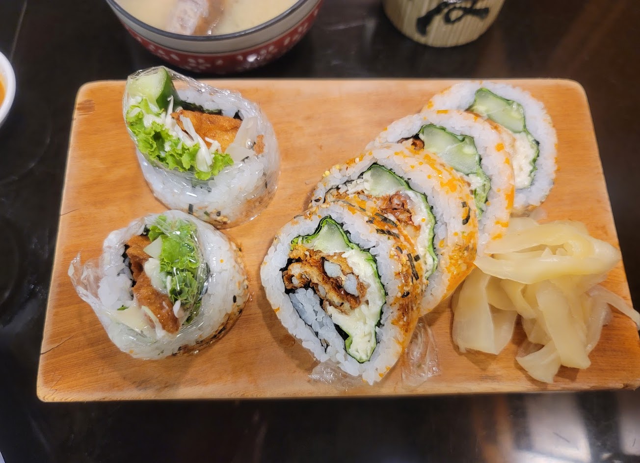 這次的餐點⬇️ 綜合生魚片(7片) 蘆筍手卷 (朋友吃的) 鮭魚卵手卷(卵少少的,飯很多,150個人覺得太貴了,有點失望) 生菜沙拉(選了和風醬,正常沙拉) 炸豬排 (建議不要點,薄薄的自助餐豬排款) 花壽司(四片、份量不多,建議可以點來吃,用高麗菜葉取代海苔,清爽)