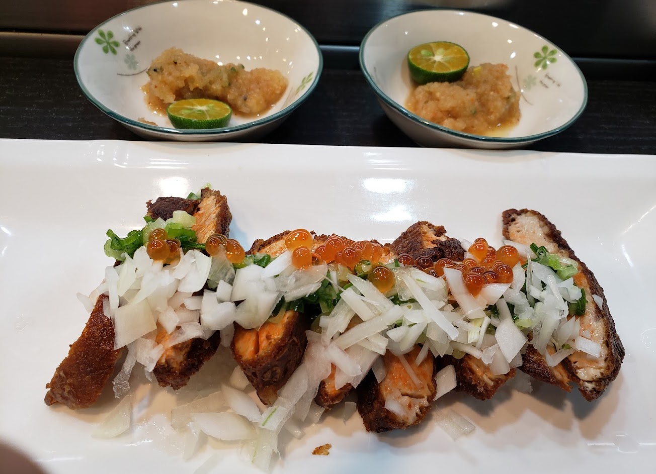 鮭魚親子丼鮭魚肉又大片厚度又適中非常好吃,搭配玉子燒、蘿蔔絲和味噌湯,非常豐盛。少一顆星是因為醋飯的部分比較不完美,另外服務態度比較不貼心,會要求客人座位換來換去(雖然是因為客人多所以這樣安排),店員突然自顧自地從桌上拿走醬料去別桌,然後明明就還在吃會一直想把擱置的飯端走。