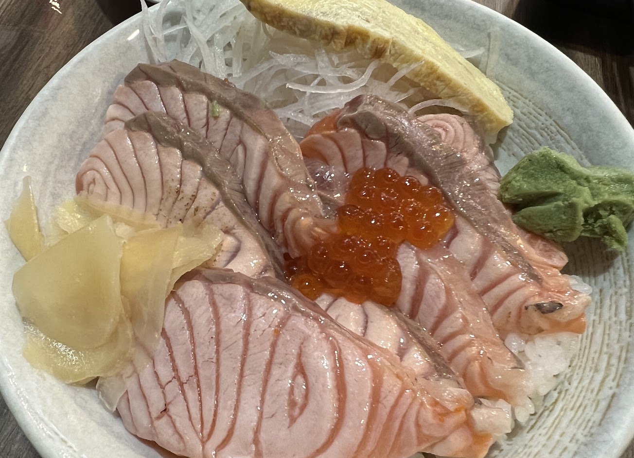 和朋友一起來一人點生鮭魚丼、一人點炙燒鮭魚丼,可以請老闆直接將一份做成半生半炙燒鮭魚丼, 鮭魚很厚新鮮好吃但飯有點多了。