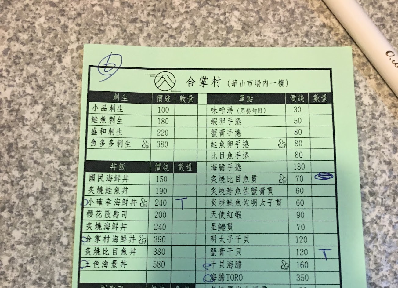 臨時起意過去排隊,排了半小時終於輪到。合掌村是一間在華山市場裡的小店面,外加很多張看起來高級的折疊桌疏散人潮,出乎意料的乾淨,但沒有冷氣這點是真的滿可惜的。