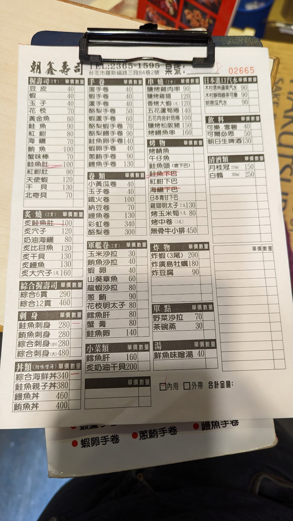 本來要去朝日壽司,因為都客滿,店家說轉角裡的朝鑫壽司也是同一間,所以我們直接過來! 看網路上很多介紹都提到平價,但我覺得雖然沒有貴但是也沒到多平價.. 滿正常的價格,比居酒屋便宜,但環境不是居酒屋的氛圍… 生食的部分滿新鮮的!烤物還好…