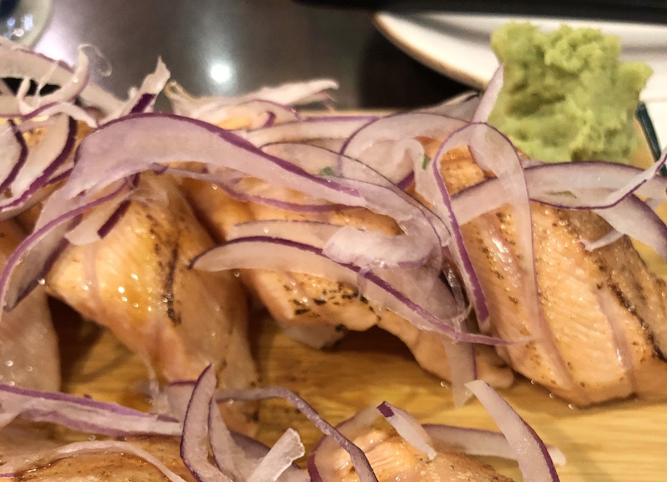 2. 炙燒鮭魚表面熟的裡面半生,結果是不錯的炙燒味中帶著油香。