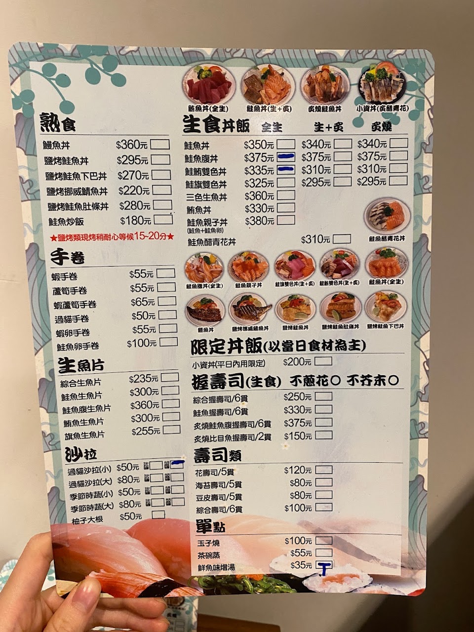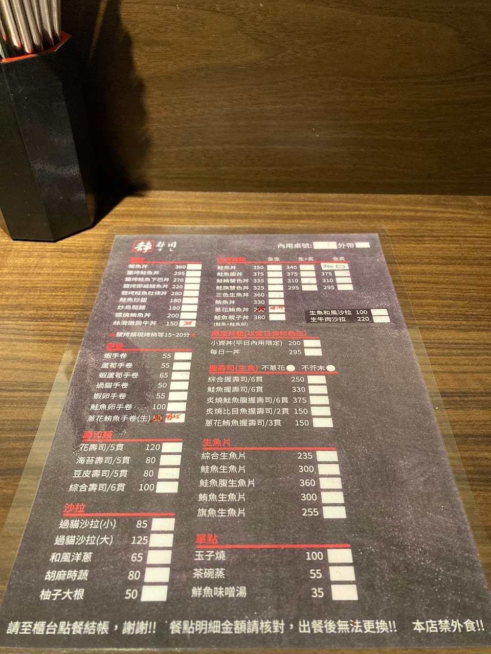 手寫菜單上的餐點,肉的份量和其他價位生魚片丼飯稍微有差距,但配合芥末仍然很好入口