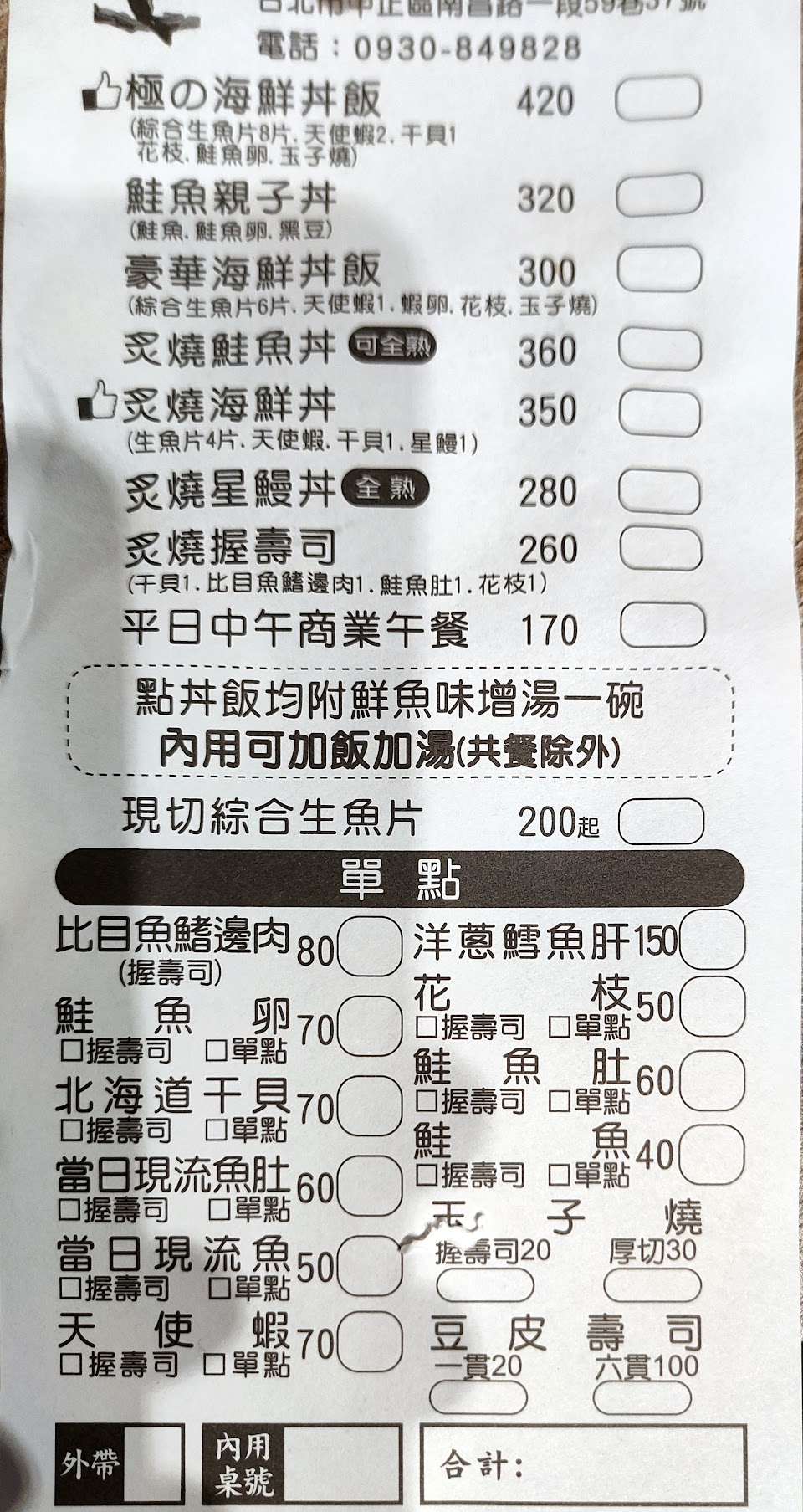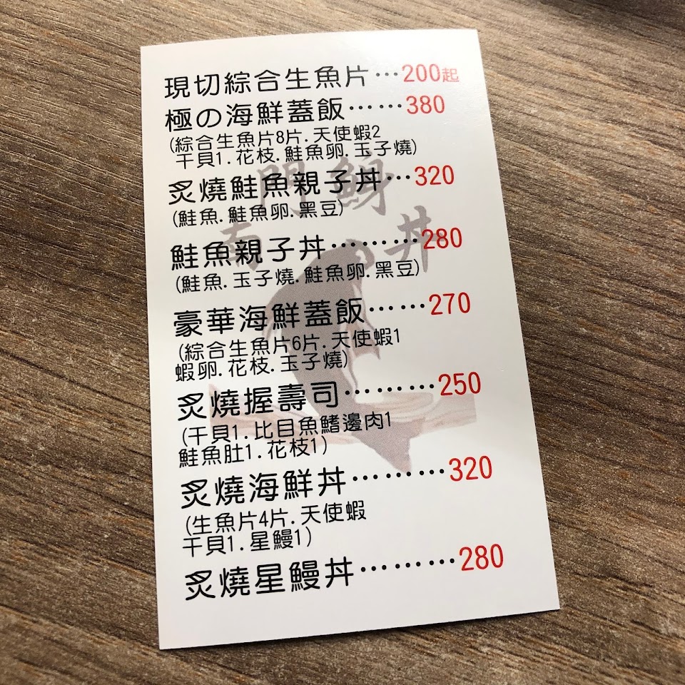 點了豪華海鮮丼$320,附一碗大碗的魚肉味噌湯,冷掉後稍微有魚腥味。丼飯的食材很新鮮的感覺,我比較怕海鮮味,這間生的天使紅蝦是難得沒有腥味的,一塊鮭魚生魚片、其他幾塊白色生魚片是鯛魚?還鮪魚?不確定,也很大塊很好吃,醋飯軟度剛好,微酸甜的味道很開胃。整體份量剛好。