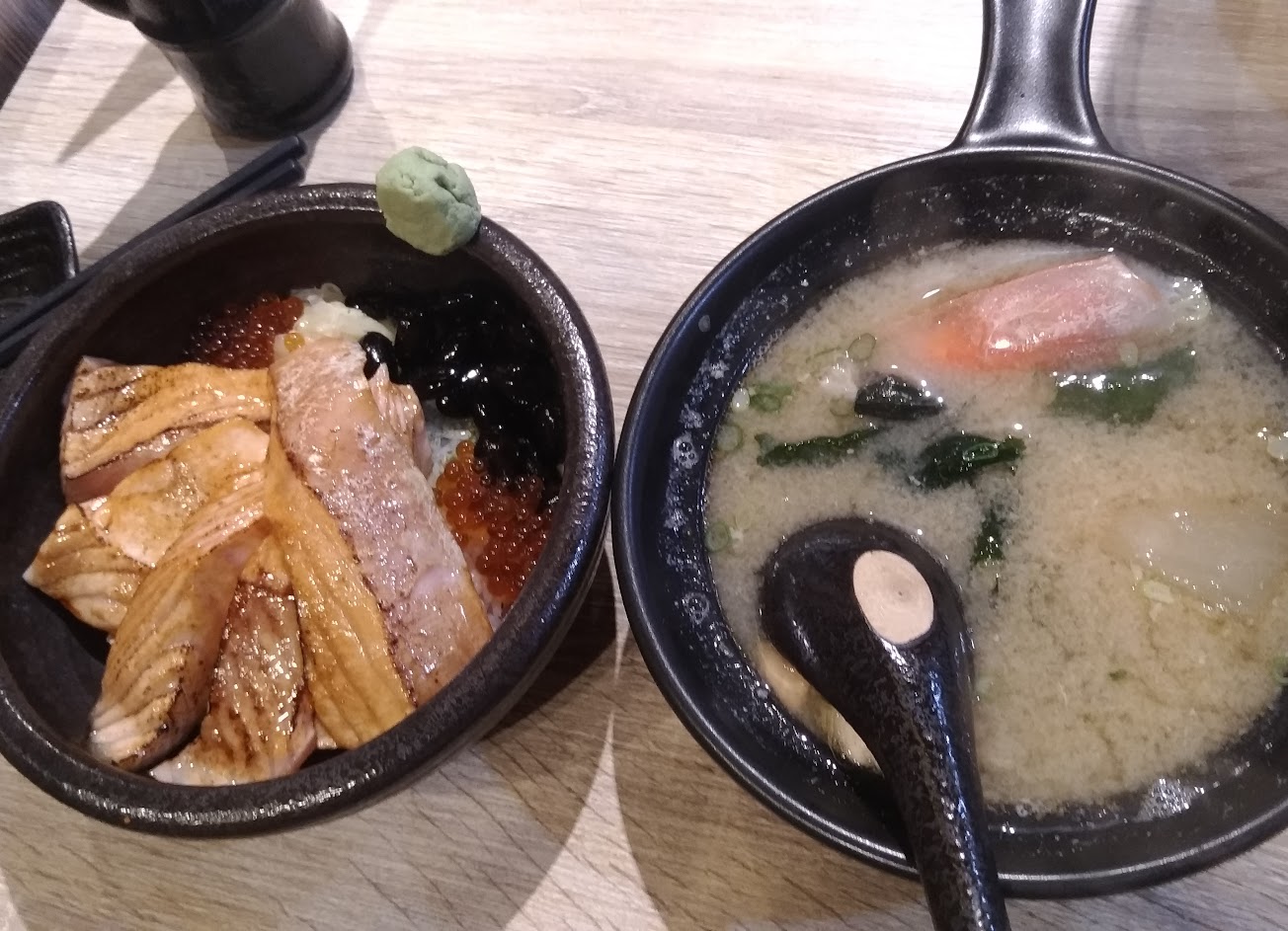 炙燒鮭魚丼的鮭魚很多片而且很厚,丼飯還有附一大碗魚湯,打卡送天使蝦,推