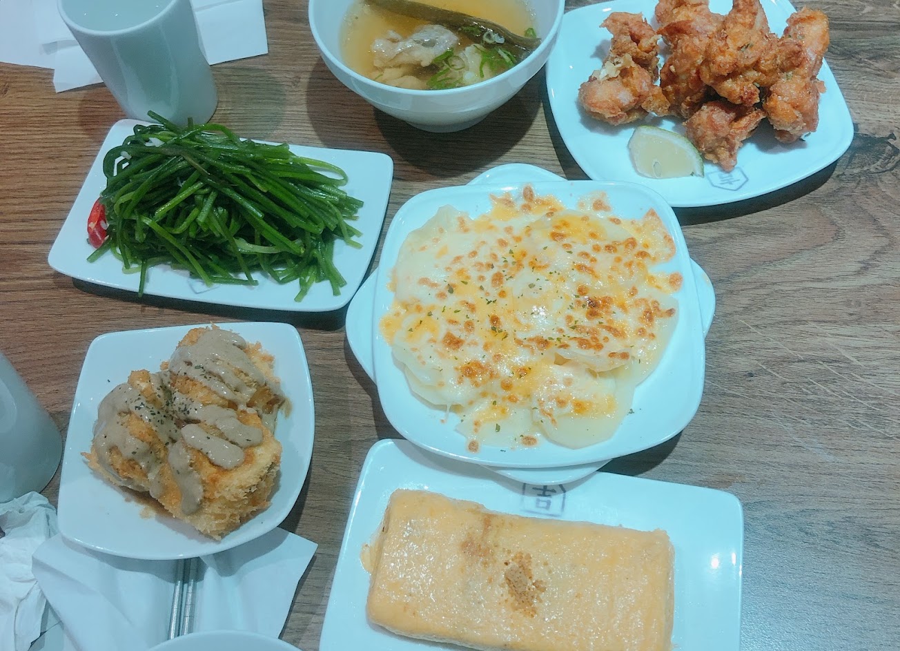 小菜真的是「小」菜,主菜起司給的很多,會牽絲,覺得滿足,唐揚雞炸的有點硬,咖喱味道還不錯,甜點鮮奶布丁不知道是不是錯覺,吃起來很像奶酪? …