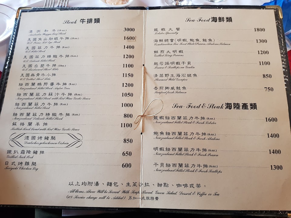 台北的老牛排館,店內裝潢個人認為偏美式復古風,是許多老台北人的回憶(不是我,我還很年輕),餐點跟服務都還不錯,是一個聚會的好地點,不過記得要提前訂位。