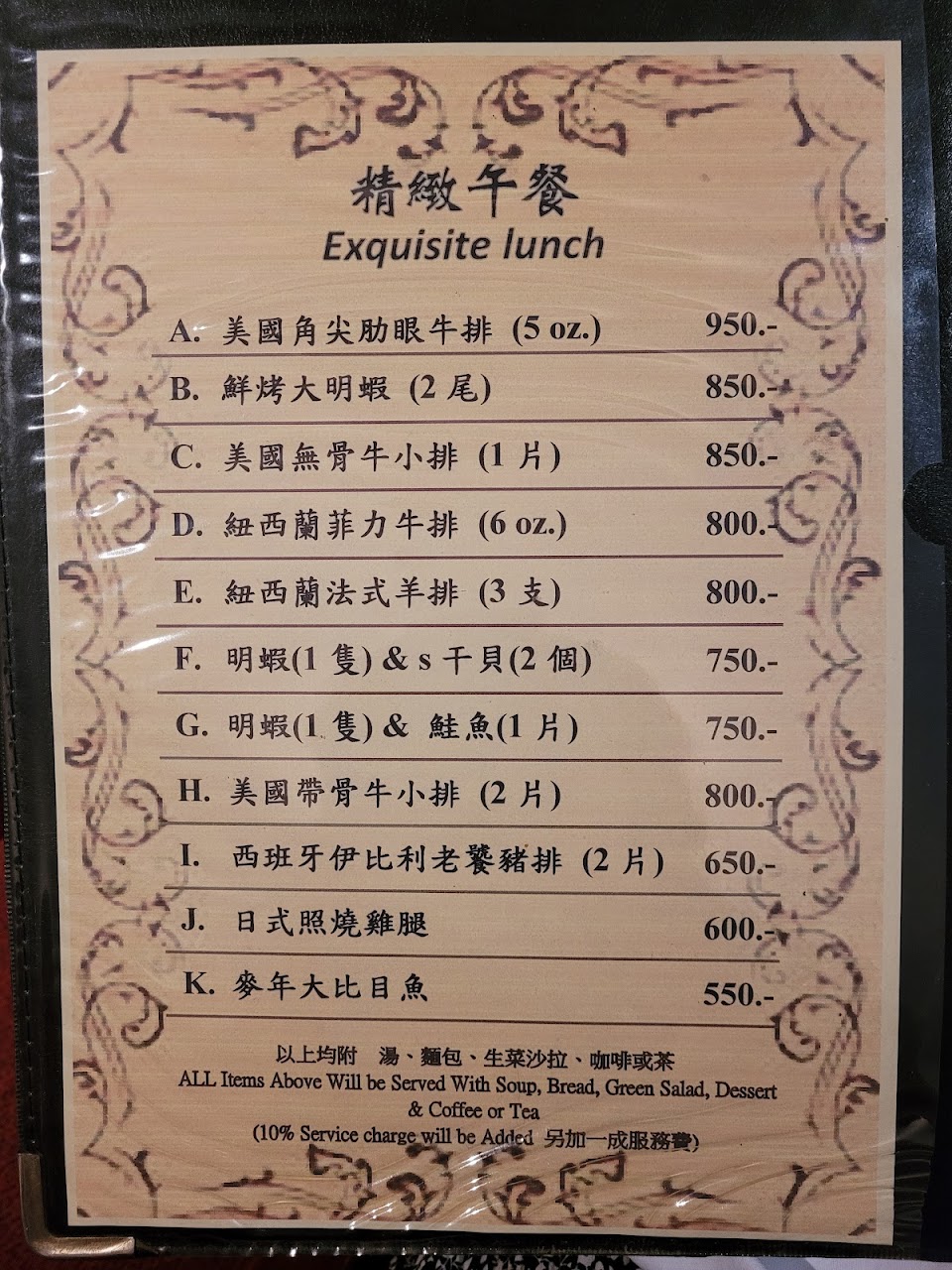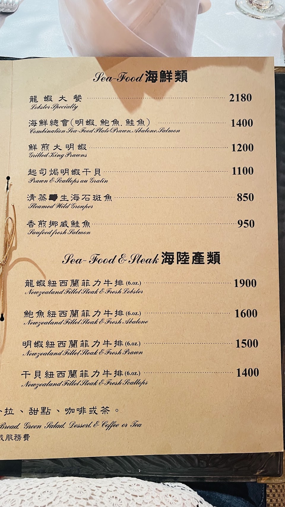 前菜、湯、麵包、菲力牛明蝦超好吃,一定要點五分熟喔!同事說鮑魚ㄧ拿到要趕快吃,否則在鐵板上一直加熱會太老,牙齒會咬不動!