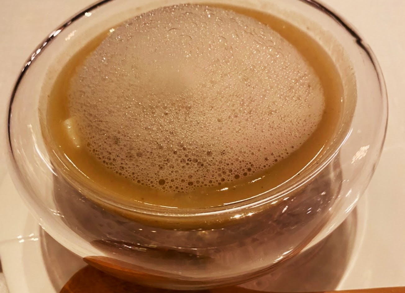 ✨麵包 兩種口味麵包:洋蔥與迷迭香,搭配黑蒜奶油,麵包可以續~黑蒜奶油沒有大蒜的嗆辣還有一點帶水果般的酸味,滋味真的很好! ✨冷前菜 應該是魚肉蛋捲?這道我就覺得比較普通? ✨熱前菜 鴨肉很肉質很軟嫩很好吃但是佐的醬比較沒什麼特別的味道,有點清淡 ✨湯品 有蘑菇水煮蛋濃湯跟蛤蜊雞高湯-個人偏愛蘑菇濃湯~把水煮蛋弄破拌在濃湯裡~好喝~ ✨甜點 桌邊式選擇一人五種甜點,覺得很有趣且還可以選五種甜點,一開始覺得很新奇,但是!少給一顆星的原因就是在甜點。 甜點個人口感覺得太甜,泡芙裡面內餡是芝麻奶油,餅皮類的甜點都不夠酥,口感都很普通,沒什麼另人驚豔的甜點;奶酪上面的醬很甜也很像外面賣的一般奶酪……