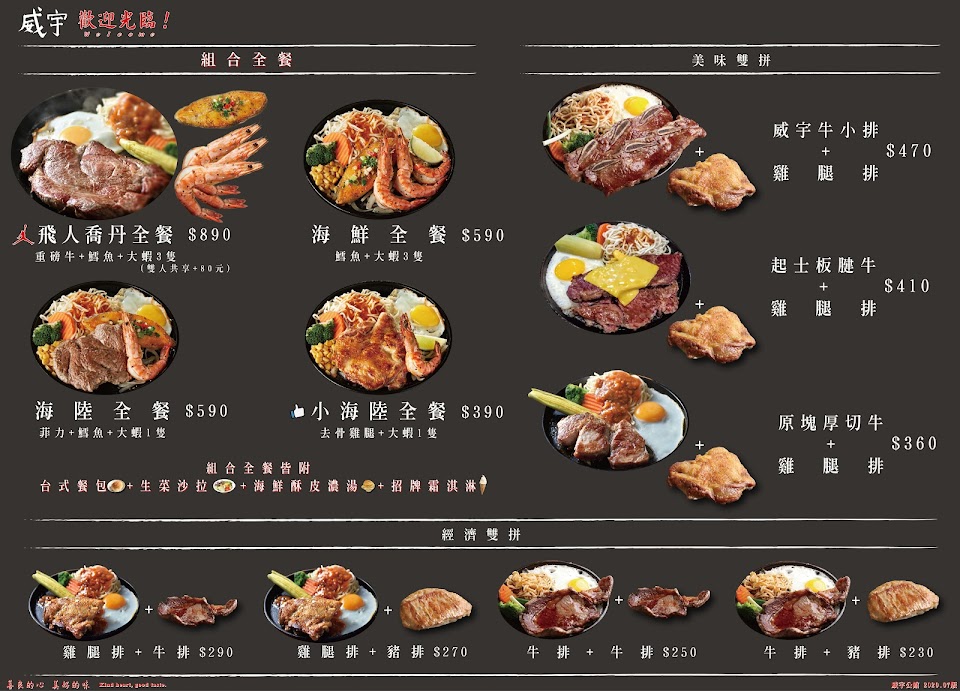 每次經過威宇牛排,都看到滿滿的人潮,今天進來嚐鮮,期待美食 服務 內用 餐點類型 晚餐 平均每人消費金額 $200-400
