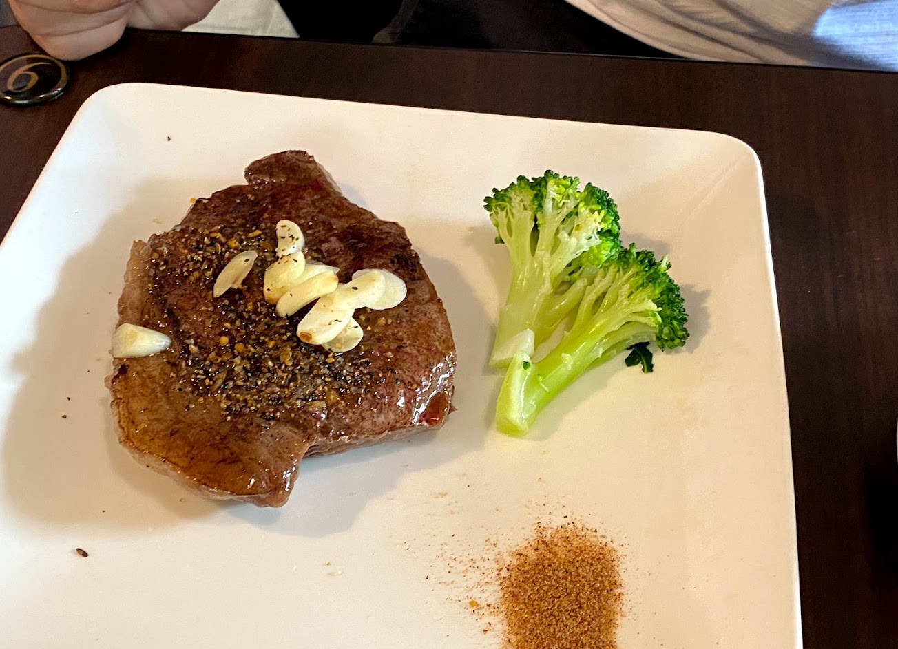 第一次吃 牛排一端上來 我??? 第一次看到159元有這樣品質的牛排 一般的店為了效率 肉都不會用這麼厚 我還以為我在吃西堤 旁邊一坨不確定是什麼鹽。紅紅看起來是匈牙利紅椒粉 上面還有一些蒜片 先嚐一點蒜再吃牛排好棒 而牛排中間的熟度也非常剛好 外圍的部分偏7分 中間少部分是5分 第一口咬下去…太好吃了吧 嚼勁剛剛好不會太硬 牛肉的香氣充滿口腔 架上滿滿的牛排調味料都沒用到 就怕他們蓋過牛肉的香氣 這樣是一種浪費 而旁邊那應該是紅椒粉加鹽巴的東西能突顯出牛肉的美味 很優秀 旁邊有一塊油脂沒修掉但對我來說剛剛好 不吃的人可以切掉 而我是切下來吃 越嚼越香