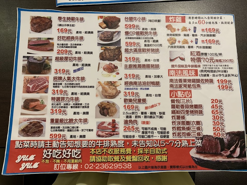 招牌寫牛排+湯 飯 沙拉只要159起,但是牛排最低159,自助吧要+40才有,而且品質普普,不過牛排除了血水沒處理好,的確不錯吃