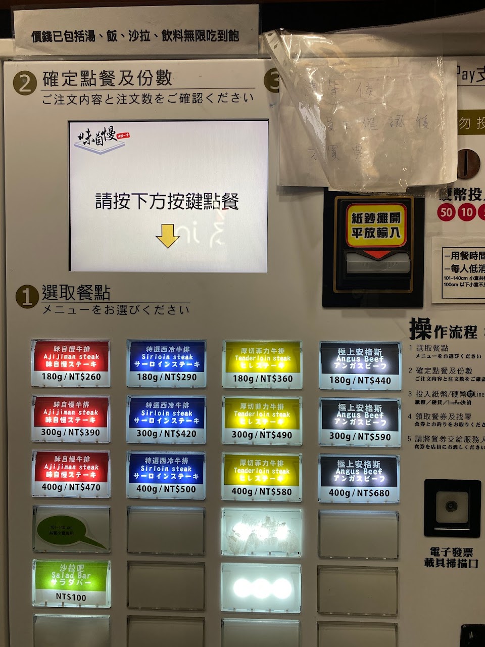 門口售票機先點餐付款,牛排是在加熱的石板上。自助吧很簡單,有高麗菜絲、白飯、飲料、羅宋湯。