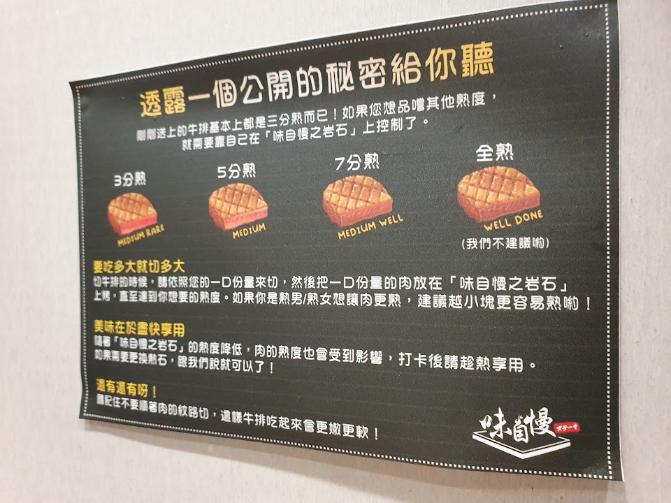 店員在進店前的點餐機會很熱情的介紹餐點,飲料、白飯、湯品沙拉都是採自助式免費供應,味自慢牛排肉軟嫩好吃雖然翼板部位有帶些筋但我覺得影響不大,個人牛肉喜歡偏生的口感,在石板上加熱可以自行控制熟度感覺很好,在店內使用的餐桌偏小材質很滑沒有固定,在切牛排時很容易移動桌子,一人一刻牛排一碗飯一碗沙拉一杯飲料感覺非常擁擠,另外建議店家可準備個放包包的籃子。