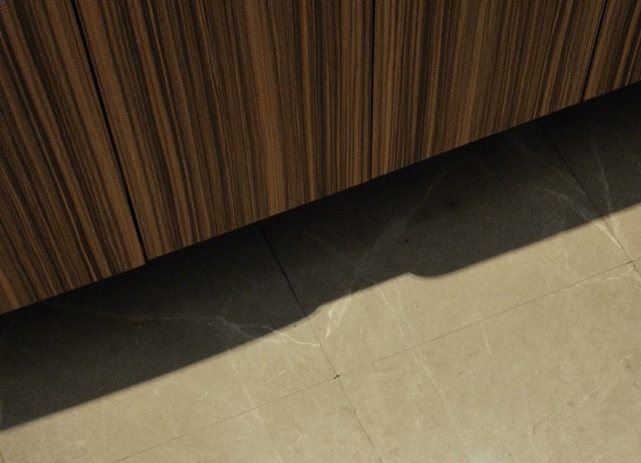 用餐區行徑地板有小電線槽坑卻是用電火膠帶黏貼,物品拖久了,就看起來破舊。