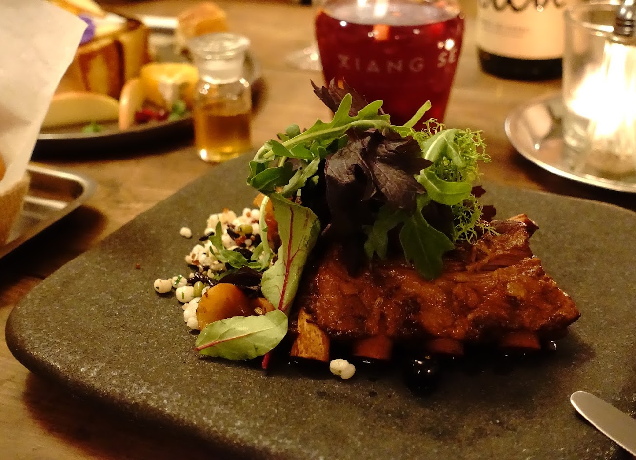 餐點部分最喜歡牛舌,微辣調味和溏心蛋很出彩。櫛瓜上頭原以為是mozzarella,結果雖說是cream cheese但根本是打發鮮奶油的質地,好拍但太heavy。主餐豬梅花有些塊較肥嫩,也有幾塊較乾,跟前菜鮮蝦蘿蔔都算整體一般。甜點加蜂巢,還拿整片蜂巢現挖算是有噱頭有創意,不過蜂蜜自然是甜得不行,洋甘菊慕斯還算清爽。
