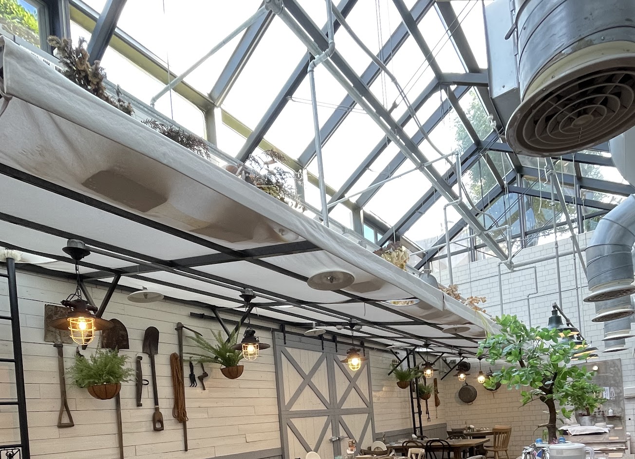 裝潢特別用心,獨特的建築結構讓整個餐廳呈現倍感加分,復古的實木桌板鐵器及櫥櫃,牆上鏽蝕的鏈條裝飾,提升餐廳質感,後方玻璃屋頂透出的陽光也讓用餐區域彷彿置身國外。