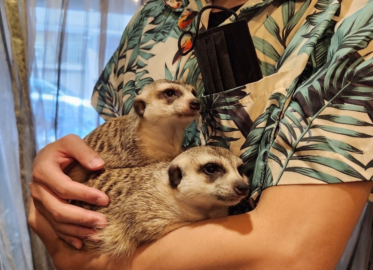 狐獴 – 老闆親自介紹可樂和木耳。老闆會指引它們爬上顧客的身上。可是記得狐獴也是個貪睡的小動物,如過它們在睡就讓他們睡,畢竟他們一整天都在陪顧客們。別擔心,老闆還是會讓顧客們觸摸它們的。