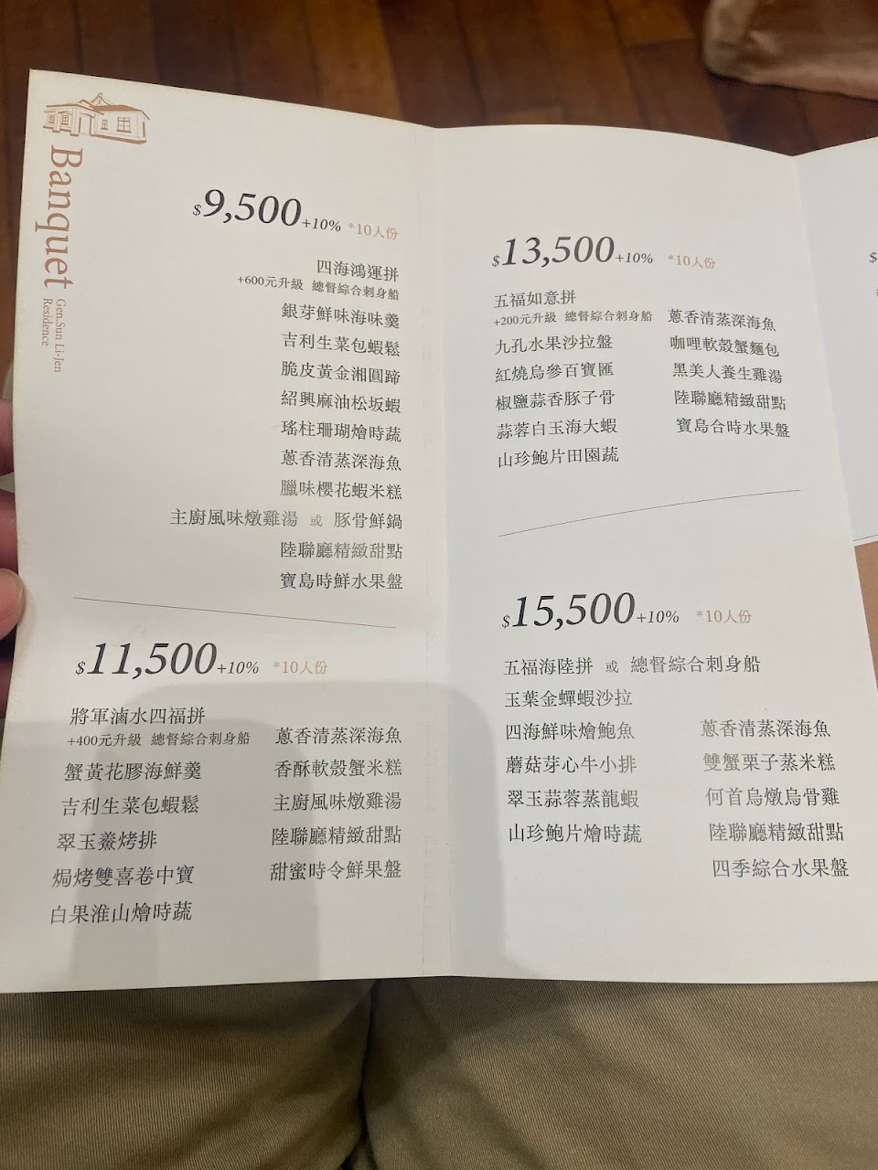 曾經路過,覺得建築及庭院相當氣派,花點時間流連,沒進去,這次參加志工活動,開會及吃飯,才真正仔細觀察整個官邸,不僅外觀氣派,裡頭的陳設也相當有份量,到處都有經過名家設計的布置,門廳及走道都有擺飾,十分雅緻,是相當大面積的舊日式建築,後面庭院整理得好,有假山水池,小橋流水,面對前後庭園都有大面窗格,屋內分隔數廳,格局都很好,大部分都是團體訂餐,我們這次也有十桌,餐點分喜宴及宴會兩種價格,都在九千到三萬元之間,是屬於比較老式的經典餐飲,據說官方及名人經常光顧,想也知道,服務及餐飲都有一定水準。