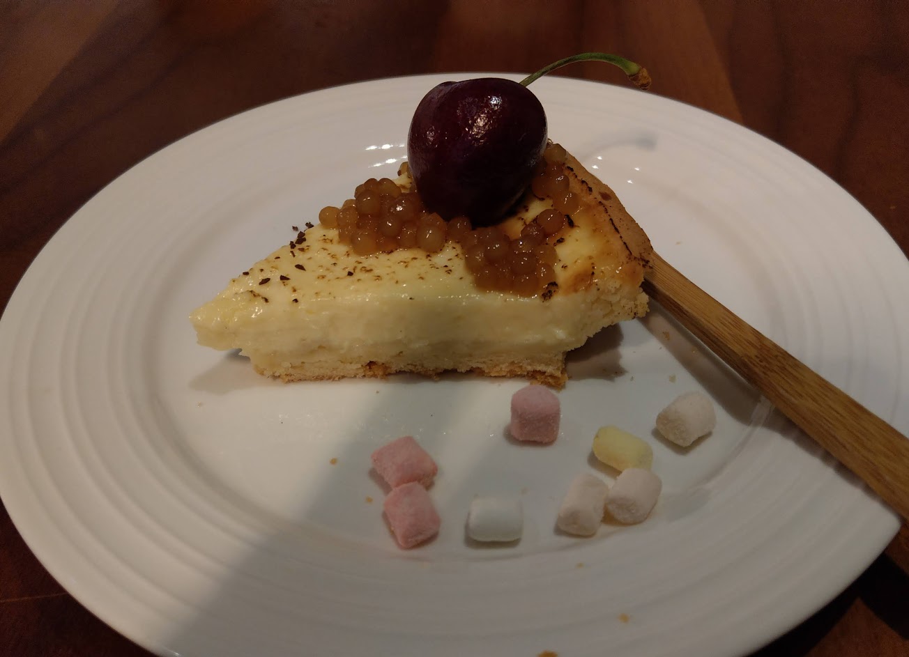 迎賓小點-火龍果紅心芭樂果汁 +香檳葡萄 手工麵包佐海鹽奶油、酸奶奶油、鴨油:麵包好吃續盤,但第二盤全體烤焦,苦苦的 莫扎瑞拉起司佐小番茄、鳳梨、蒟蒻凍 熱前菜-1鹹餅乾、鮭魚卵、北海道干貝沾蟹膏醬 熱前菜-2米餅包紅酒燉牛肉:除非分層吃,不然容易邊吃邊掉。 熱前菜-3鴨肝烤布雷:鹹鹹甜甜的口感,蠻微妙的 洋蔥松露巧達湯:中規中矩。 紫蘇梅冰 酥烤鴨胸:還不錯,下次會想點。 脆皮豬腳:最喜歡這道,倒不是因為口味或口感表現突出,只是單純因為本身喜歡德國豬腳,但下次會想換其他主餐試試。 香料戰斧豚:擺盤頗氣派,口味中規中矩。 小老饕牛排:雖然朋友因為吃慣上千的牛排,對她來說筋太多,咀嚼的很累,但大家還是認同是有符合這個價位的牛排水準。 香料海大蝦:沒有吃到,但朋友說還不錯。