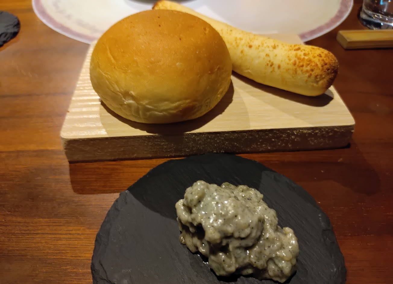 手工麵包佐海鹽奶油、酸奶奶油、鴨油:麵包好吃續盤,但第二盤全體烤焦,苦苦的