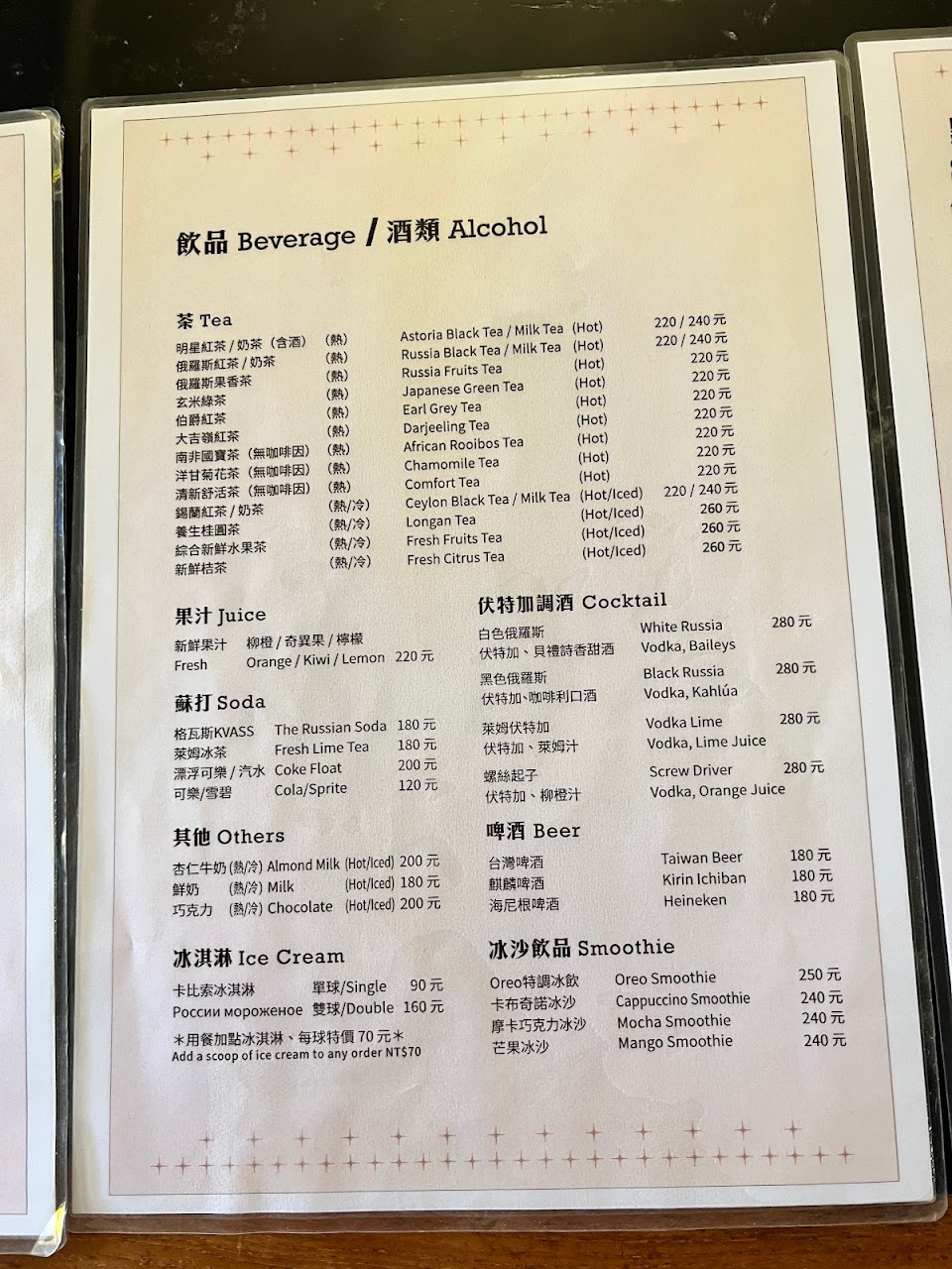 台北老牌俄羅斯主題店,餐點價格略高,但有特色且口味佳,燈光及裝潢有老屋氛圍。