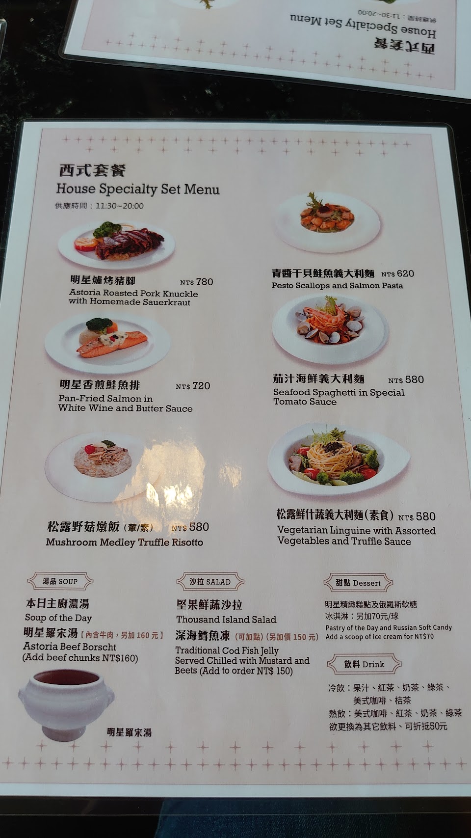 綜合以上,我會再回來吃,因為氣氛、服務都讓我有溫馨的感覺。 服務 內用 餐點類型 午餐 平均每人消費金額 $400-600 餐點:5 服務:5 氣氛:5 建議的餐點 沙皇羅宋湯 明星爐烤豬腳