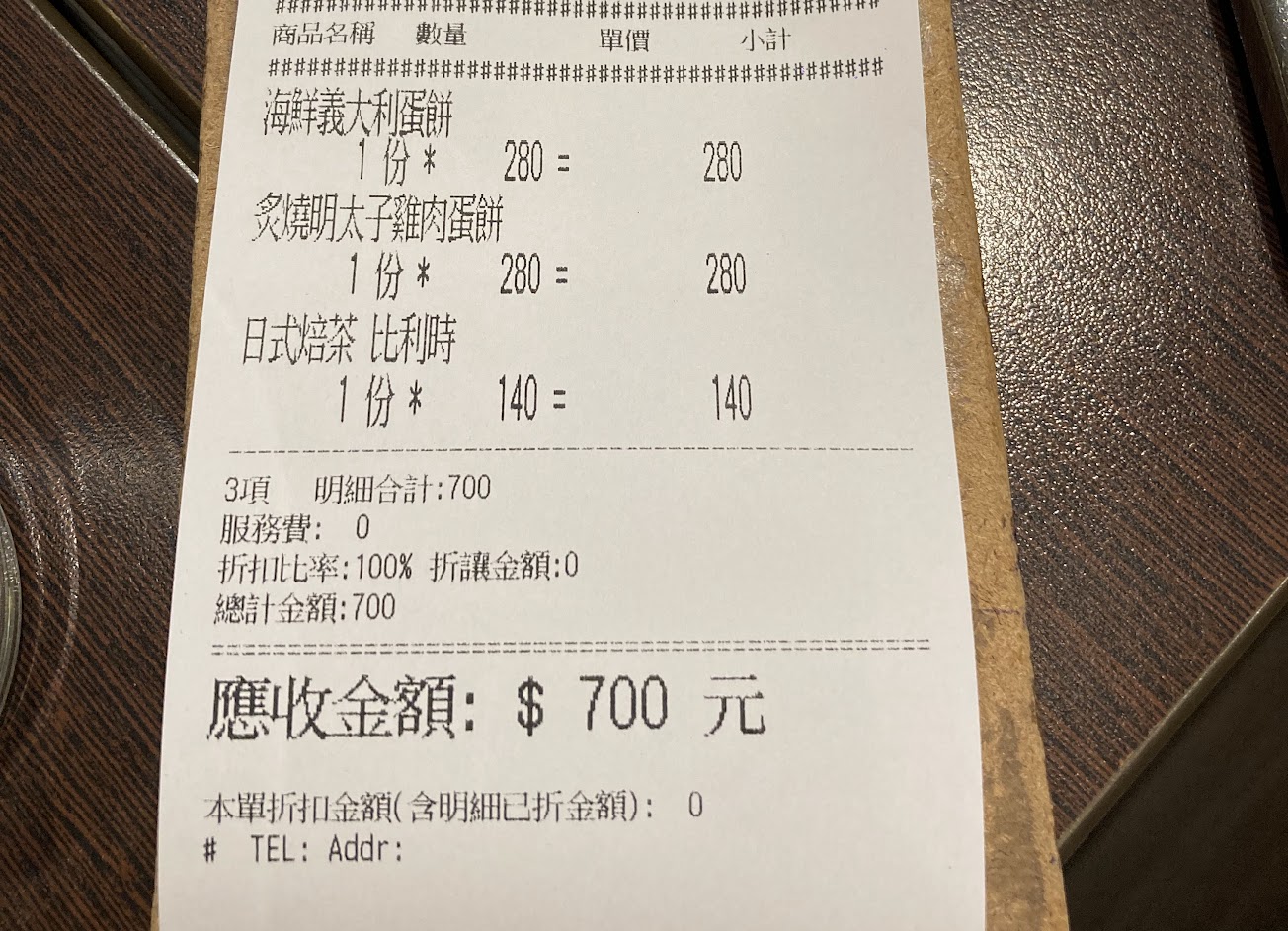 雞肉比預期的多,也算是多汁,除了雞肉外還有小白菜、培根、馬鈴薯、洋蔥,可能因為是雞肉,不像是海鮮蛋餅很水,這點還不錯